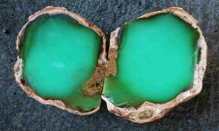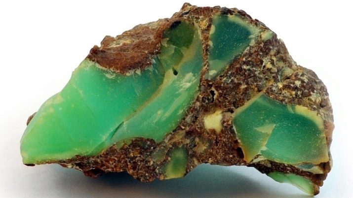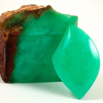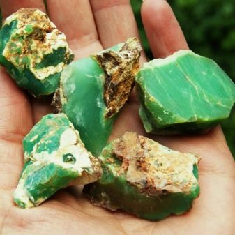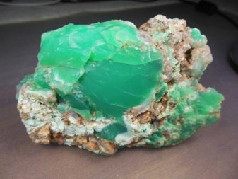 As a geological aggregate, a mineral consists of the smallest grains of crystalline origin with a size of 0.5–50 μm, distinguished only with a microscope. Unlike other, less transparent types of quartz, the mineral is valued not so much for patterned patterns as for color. Chrysoprase is rich in all colors and shades of green.