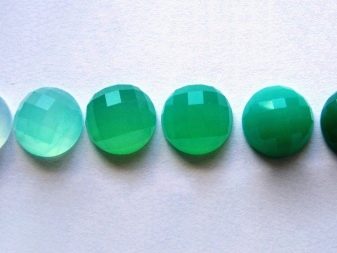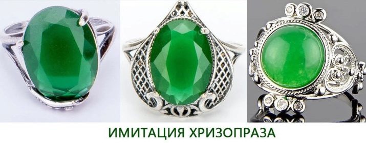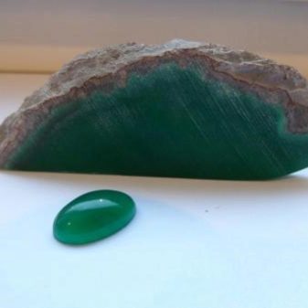 Artificially colored chrysoprase is called green onyx. It may have a lemon green or blue color. Green chalcedony mined in Zimbabwe, due to chromium impurities. It is commonly called green agate or morolite.. Separately, blue chrysoprase is isolated, which contains chrysocolla inclusions. Recently, a stone has a large number of imitations made from cheaper chalcedony. Imitation staining is performed using chromium or nickel salts.
