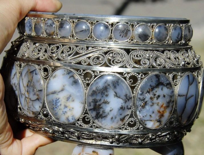 Gold is not used for frames, since this material does not combine with the calm and delicate color of agates.