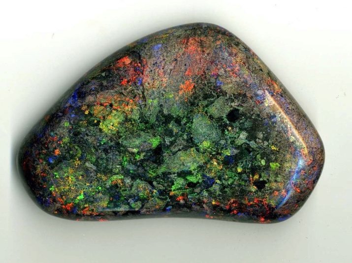 - Harlequins. The mineral received such a name thanks to the characters of Italian comedies, whose attire consisted of numerous multi-colored pieces of fabric. These stones are distinguished by an amazing colorful pattern in the form of numerous spots or shapeless figures of red, blue, yellow, green and purple colors. If you put such a stone in your palm and bring it to the sun, a real rainbow will sparkle on your hands.