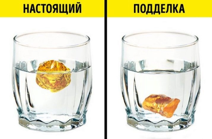 Take a glass of water, add 8 teaspoons of salt into it, stir and lower the stone there. You can evaluate the result by the fact that the stone drowned or not. The original will not drown, nor will the product made of pressed amber or digging drown.