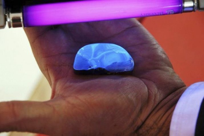 Mineral made of natural stone reacts to ultraviolet light. Ultraviolet light makes it possible to see wave-like transitions and an inhomogeneous structure.