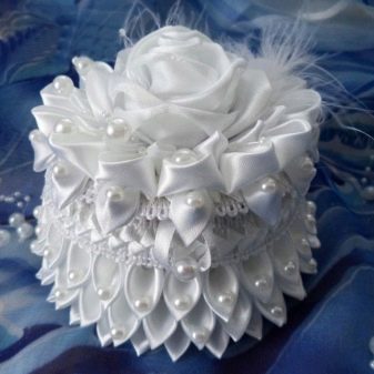 The lid will be almost completely decorated with petals, the emptiness formed in the center is trimmed with a flower - it can be purchased ready-made, made from organza or also rolled up from ribbons, like kanzashi.