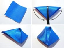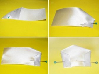 - From the prepared segments of the white satin, you need to make parts of the bow. The tape is placed face down, the right corner from above is bent inward, fixed with a pin, the lower left part is similarly fastened. The pointed tip bends inward.