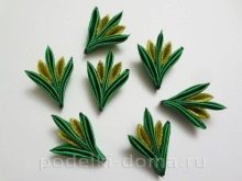 - Green satin squares fold diagonally 2 times. The obtained blanks connect the ends at a wide base, singe them. Then the lower part is cut off, getting a "petal-boat", equally wide along the entire length. Billets in the amount of 21 pcs. connected in twigs by 3. Secure with fire at the base.