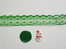 - On the underside of the bow, a felt base circle is glued to a thin satin ribbon. You need to use a thermal gun. On top of the front side is attached a green snowflake.