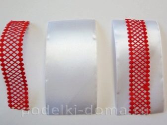 - To create the base of the bow, you need to combine wide satin ribbons of 5 × 10 cm with a decorative mesh in contrasting color. Narrower material is centered. The ends of the tapes are combined, bending in half with the front side outward, fixed, singeing with fire. The action is repeated for all 4 parts. You should get 2 red volumetric loops with white lace and 2 contrasting ones.