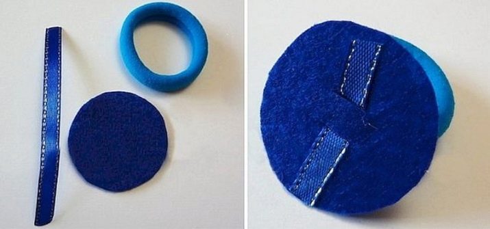 In the center of the prepared part, 2 slots with a length of 7 mm are created. A narrow satin or rep ribbon is threaded through them so that a small loop remains on the outside. If the product is attached to an elastic band, it is threaded inward in advance, and the cuts are arranged in parallel through 0.5 cm. Then the edges of the tape are displayed on the back side of the circle, the elastic band is glued to felt for greater reliability. The edges of the satin stripes are cut to the diameter of the circle, fixed with a thermal gun.