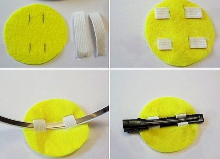 If you need to make a multifunctional mounting option, use a combination of felt circle and rectangle. It is considered universal, suitable for the manufacture of elegant clips, rubber bands. The felt rectangle in this case is first fixed on the fastener by the adhesive method. Then it is applied to the circle and the edges are “soldered” with a thermogun. Excess material is cut to the edge.