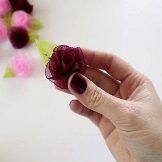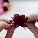 - We tighten the thread, from this matter gathers in folds, and fix it. We get a fragment of a flower. It will require 11 petals: the first and second rows of three, and in the third row - five.