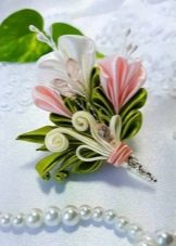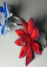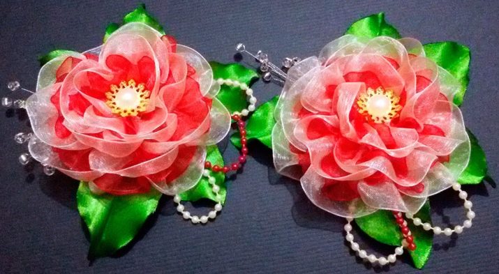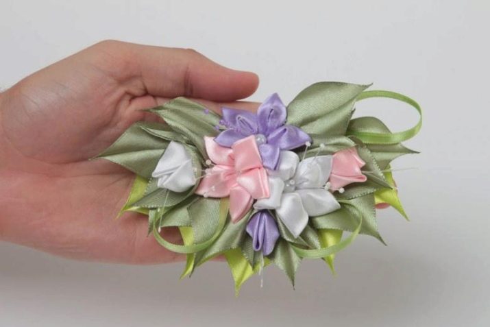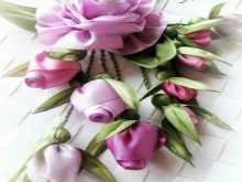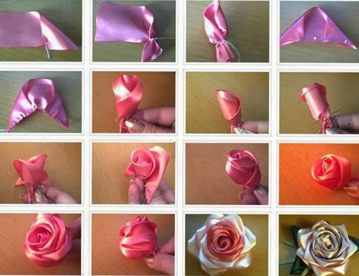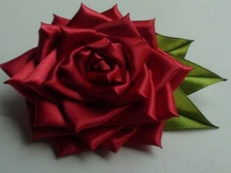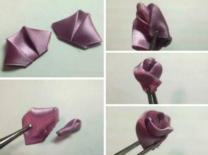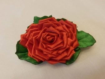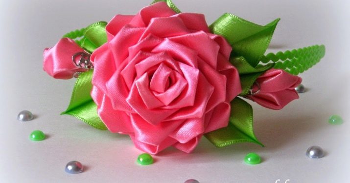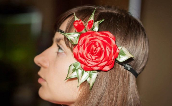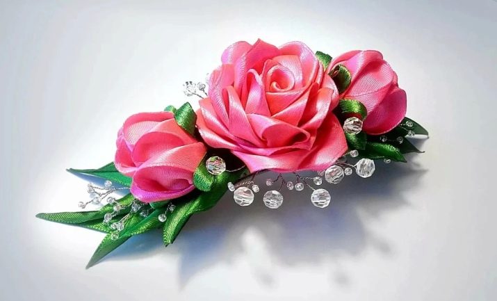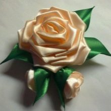 Pieces of fabric are used to create flowers, leaves and stems. Pre-cut into squares, folded in a certain way and connected in series. Roses using the kanzashi technique are rich in colors and sizes. Forms also vary: there are rounded, pointed and wavy, there is only a blossoming flower and with a lush crown. They frame the composition with leaves, complement with rhinestones, beads.