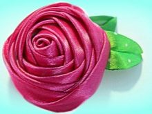 - From the green satin ribbon 8 cm long, we prepare the leaves. Fold it in half and cut out the halves of the leaves. This is done with scissors or a soldering iron. If cut with scissors, then the edges are melted on fire. Turn the leaves and glue.