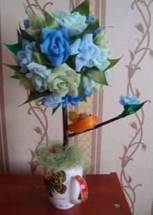 We make the topiary. Wrap the flower trunk with tape, decorative paper or braid. Glue the base ball to the stem of the future flower and begin to attach the flowers to the base as tightly as possible to each other. We take the container for the vase and fill it with diluted alabaster or gypsum, wait for the material to begin to set. We insert a tree into the mixture. We are waiting for complete solidification and decorate it with an imitation of grass.