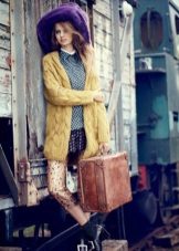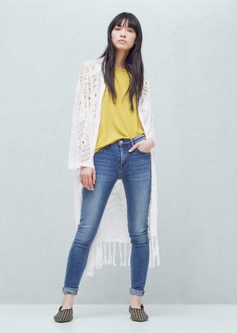 Wear a yellow elongated cardigan with a lace braid in the shape of a braid with brown skinny jeans. Observing the rules of three colors, wear a light, light blouse. As accessories, choose a pendant and bag to match the jeans.