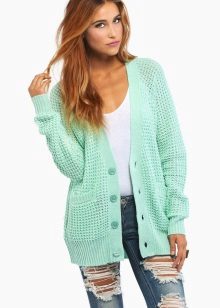 A turquoise fitted cardigan is best worn with plain clothes. Therefore, wear a white dress in the shade of “ivory” with a black border and small buttons on the bar. Fasten such a cardigan on a large brooch at the waistline, so you add romance to your bow.