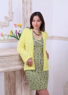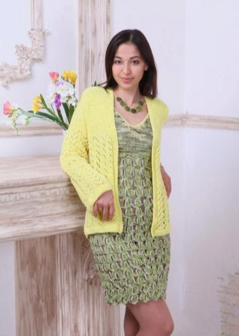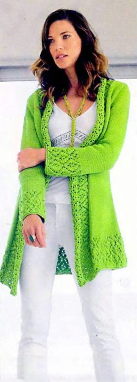 Also, a sleeve and a bottom can be decorated with a similar strap, for example, a long green cardigan with a lace plate made of rhombuses will become a bright addition to your summer bow