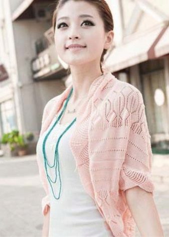 Openwork cardigan is able to create romantic images. Wear a smoky rose cardigan with a white sheath dress. As accessories, choose a thin string of green pine beads.