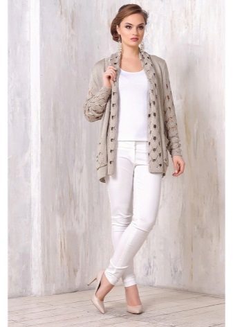 A total white look is easy to create with an elongated cardigan, lightweight trousers and a T-shirt. This image will be ideal for evening walks in the summer.