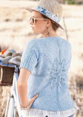 Openwork yoke can be knitted from threads of the same color as the main product, or it may differ in color