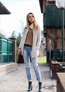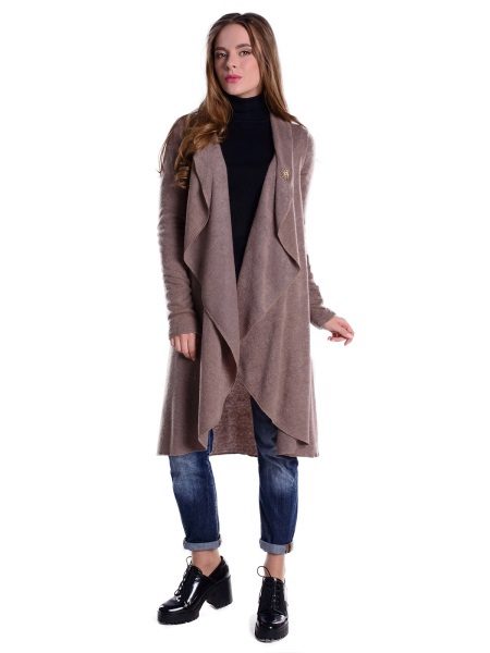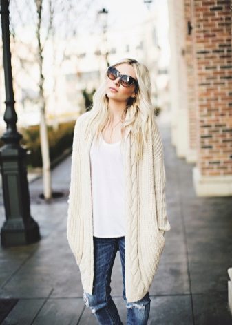 Most often, long cardigans are cardigans with a length just above the knee. There are models with an asymmetric hem, when the top is shorter, and the bottom can be up to the middle of the calf or ankle-deep. A long cardigan can be sewn from knitted fabric, or it can be knitted.