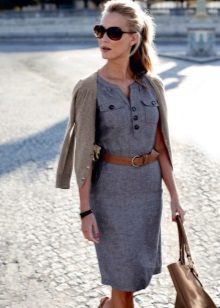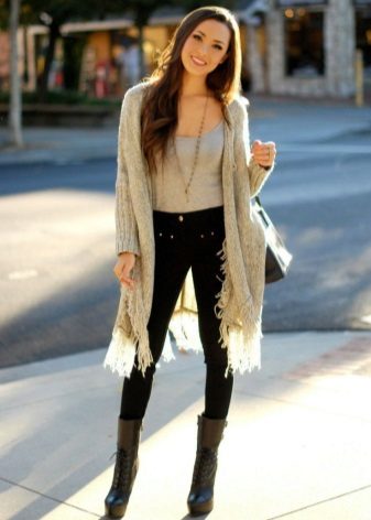 Dilute a black dress with a beige lace cardigan with a large brown bag and lace-up boots. A thin strap and a pendant on a long chain will make your bow complete.