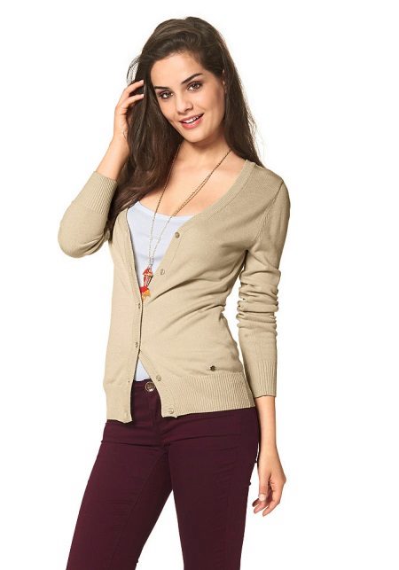 Short cardigans are also represented by a variety of textures and shades of beige. Short cardigans are most often found with decor. As a decor for a beige short cardigan, designers offer rhinestones, beads or sequins.