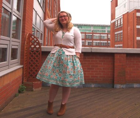 On a warm autumn day, go shopping in denim shorts and a floral print tank top. Put on an oversized beige cardigan. Finish off your look with brown boots and a large bag with a reptile texture.