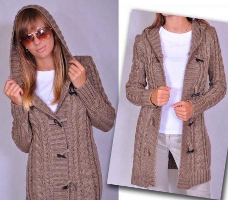 Models with a hood can be with prints, openwork or striped. The hood can be knitted in the same fancy pattern as the main product. And maybe another texture.