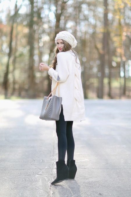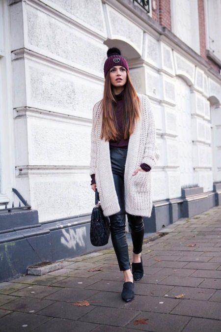 Put on a long cardigan without buttons with leather trousers and a plain t-shirt. Low-running shoes with metal decor and a bag with a reptile texture will become your indispensable friends when shopping. Wear a hat in the cold season.