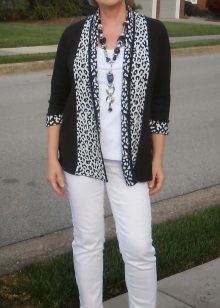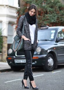 "Pea" cardigans are not recommended to be combined with clothes with the same print, it is better to choose plain clothes in contrasting tones. Solid trousers or jeans combined with the same monochrome top under a cardigan will be a great choice.
