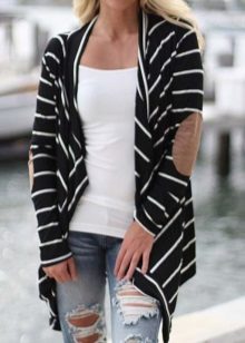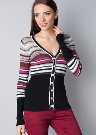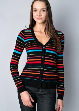 If the product is knitted, then various variations of the stripes on it simply amaze the imagination. They can be vertical or horizontal, located diagonally or descend from front to bottom from the upper back. When choosing such a model, you should take into account the features of the figure and possible ensembles in which the striped cardigan will be included.