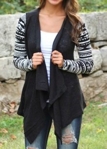 Models with asymmetric hem can be both shortened and elongated. In the first case, such cardigans serve as a stylish addition that visually corrects the figure - the unevenly cut hem conceals the absence of a waist and a small tummy.In the second case, the asymmetric length perfectly replaces the train, which not only gives the image a little more femininity, but also imperceptibly masks the full buttocks.