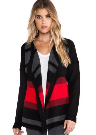 The wave of popularity of the “striped” print in clothes did not pass over cardigans. Moreover, it is used not only as images on the material. Often, the fabric of the product itself has a volumetric striped texture. This applies primarily to knitted patterns.