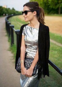 White or black cardigan is suitable for publication. It will look beautiful, complemented by gold or silver accessories, shiny fabrics with a spectacular finish in the form of sequins, rhinestones, beads. The neutral color balances the image, and it will not look too elaborate and catchy.