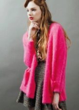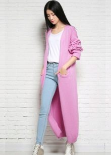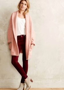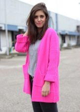 - A great look for every day: a light cardigan + black skinny jeans or trousers + pink voluminous Lalo cardigan. As an accessory, you can pick up a handbag in tone with a cardigan.