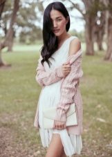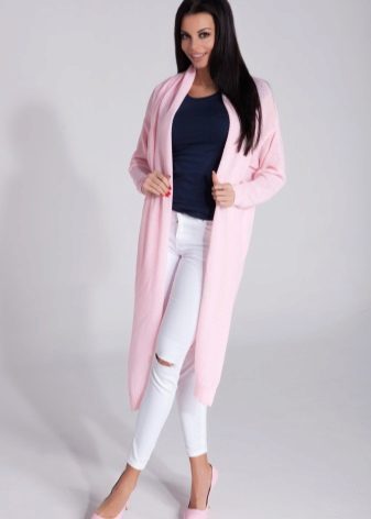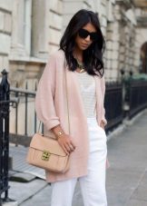 Light pink cardigans are perfectly combined with things of light or pastel colors - white, light blue, beige, pistachio, mint, pale yellow, etc.