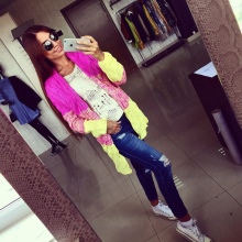 - An interesting youth option: ripped jeans + pink blouse + Lalo cardigan, made in a combination of pink and blue. The striking image will be complemented by bright, contrasting color high-heeled shoes.