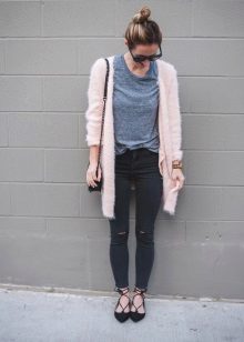 - Very stylish bow: skinny white ripped jeans + a black top + a long cardigan of thin knitting of pale pink color.