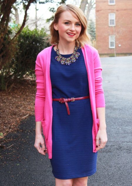 A cardigan made of dense knitwear and having a rich color will look good with jeans, shorts and skirts, a plain trouser suit, a sheath dress of a restrained classic color, etc.