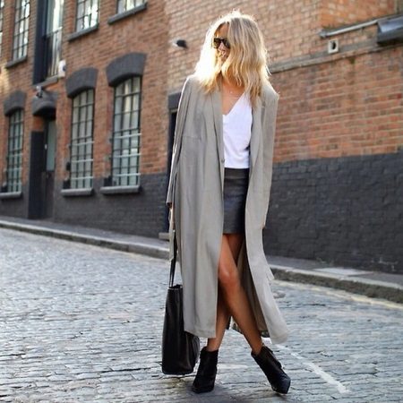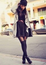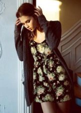 To create an unforgettable look for a romantic date, wear a gray cardigan over a short dress with a floral print. A cardigan may be longer than the dress, then it should be unfastened. Bright shoes and a small handbag fit perfectly into the image.