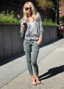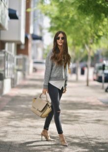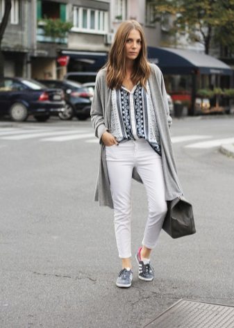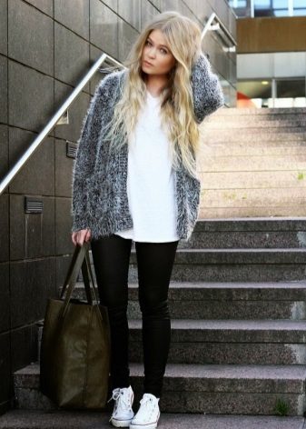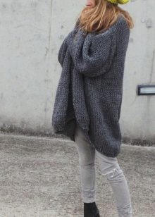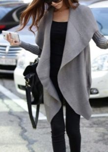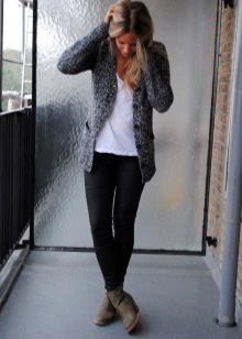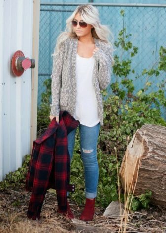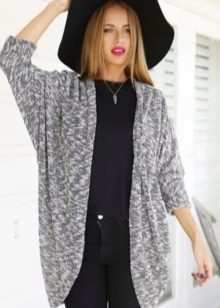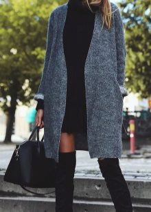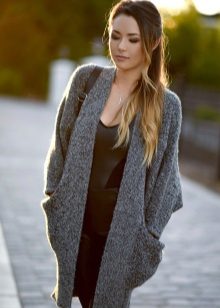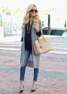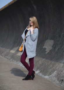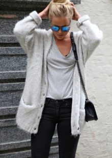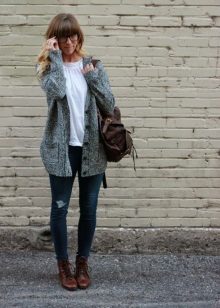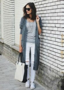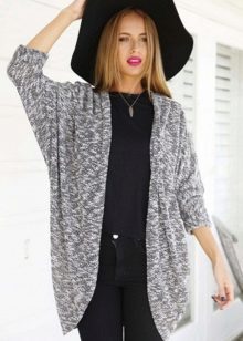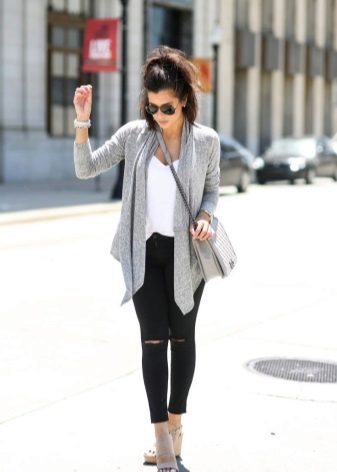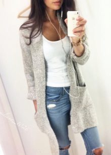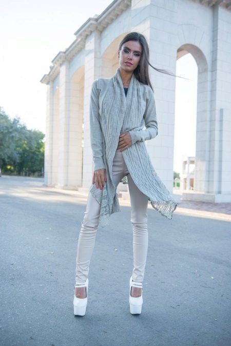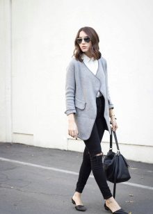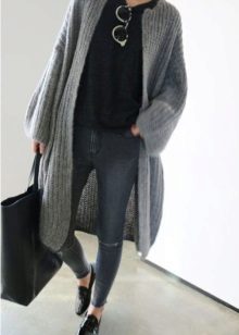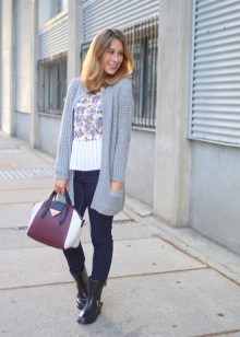 A gray cardigan goes well with clothes for everyday wear: vests and shirts, jeans and leggings, t-shirts and shirts and so on. You can complement the stylish bow with a narrow or wide belt, thereby emphasizing the waist. 3here the principle of convenience is respected in everything therefore, when choosing shoes, you can safely wear slippers, moccasins or shoes with a steady heel.
