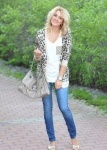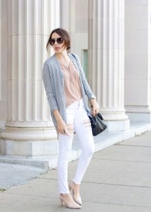 For a vivid image, it is worth choosing saturated tones. For summer, jeans and a light pink t-shirt in tandem with a gray cardigan and a handbag in tone are suitable.