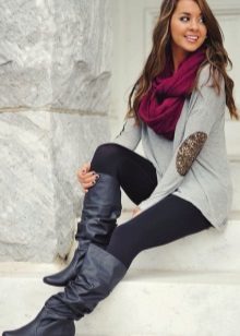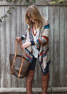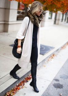 For everyday wear, you can use a combination of jeans with a milk tank and a gray warm standard cardigan. Pointed-toe brown boots are a great choice for an autumn cool day. An elegant scarf with different prints will complement an attractive bow with a matching clutch to match the boots.
