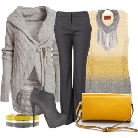 The combination of gray and yellow looks spectacular. Gray trousers of a classic cut with a bright tunic and a gray cardigan create an excellent tandem. Gray stiletto heels will visually lengthen your silhouette. The yellow handbag perfectly complements a charming bow. When choosing jewelry, you can give preference to a massive gray necklace and a bright yellow bracelet.