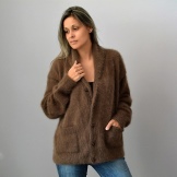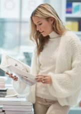 Today, fluffy voluminous cardigans from angora are again in trend. Designers offer vivid combinations of this top with a strict pencil skirt. Such a tandem looks elegant and stylish.
