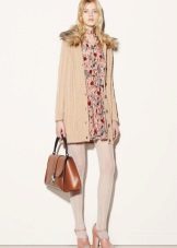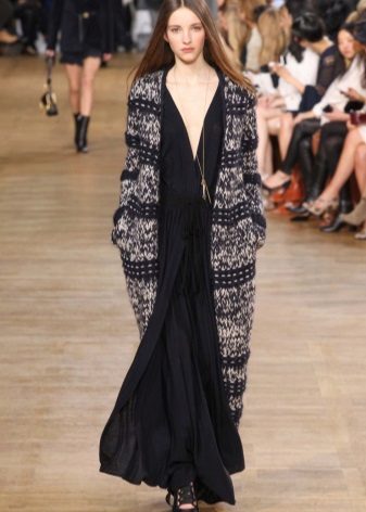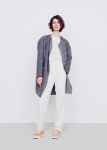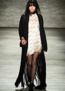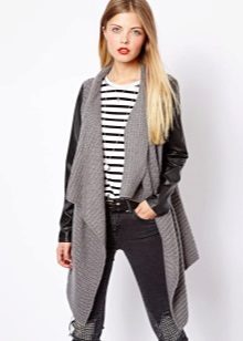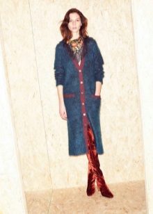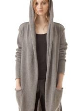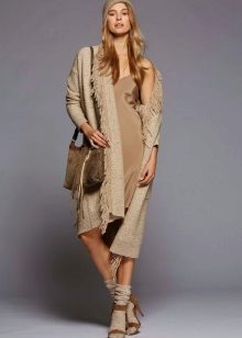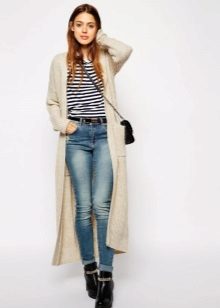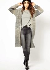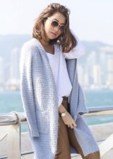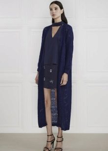 This season, trendy long cardigans made of thin knitwear. They should be combined with leggings, short dresses or sarafans, skinny jeans and capris, as well as with skirts of a straight or flared cut.