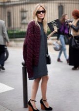 Cardigans can be safely combined with different elements of the wardrobe. The choice of color scheme is individual. To create a feminine bow, a burgundy cardigan is in perfect harmony with an orange dress. Golden shoes and a handbag in tone will add an image of completeness.