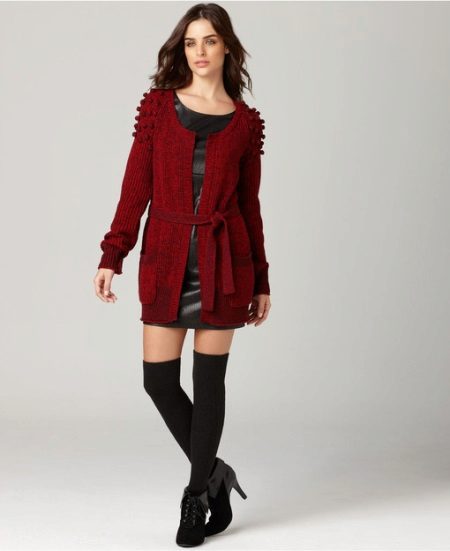 The combination of a black short dress with matching stockings and a knitted warm burgundy cardigan looks bright and attractive. Decorative elements on a cardigan give uniqueness and originality. In this way, you can appear at a party or in a club.