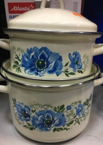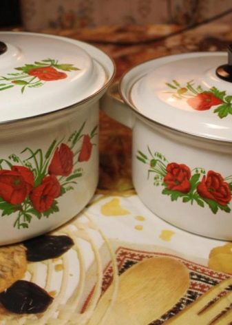 Enamel pans, first of all, are distinguished by their beautiful appearance: they are multi-colored (which is convenient when choosing a shade suitable for the interior), various drawings are applied to them. But this is not their main advantage.
