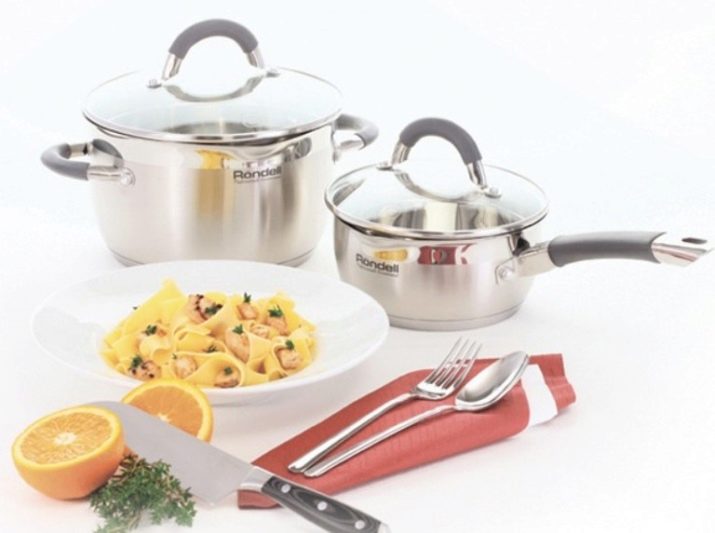 First of all, it is important to pay attention to the material from which the subject of kitchen equipment is made. For example, it is believed that aluminum pots are among the most inexpensive. In addition, they are fairly light weight and easy to care for. But, despite these positive qualities, aluminum pans are subject to deformation and quickly lose their luster; also, when cooking dishes in such utensils, your food may burn. On the other hand, stainless steel pans are very popular (most of Rondell's products are made of this material). This material has an aesthetically pleasing appearance, is durable and functional. The disadvantages of stainless steel pots include a rather high cost.